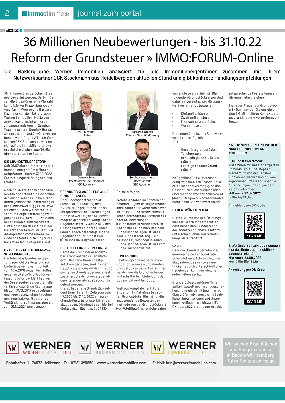 Die Maklergruppe Werner Immobilien analysiert für alle Immobilieneigentümer zusammen mit ihrem Netzwerkpartner GSK Stockmann aus Heidelberg den aktuellen Stand und gibt konkrete Handlungsempfehlungen.